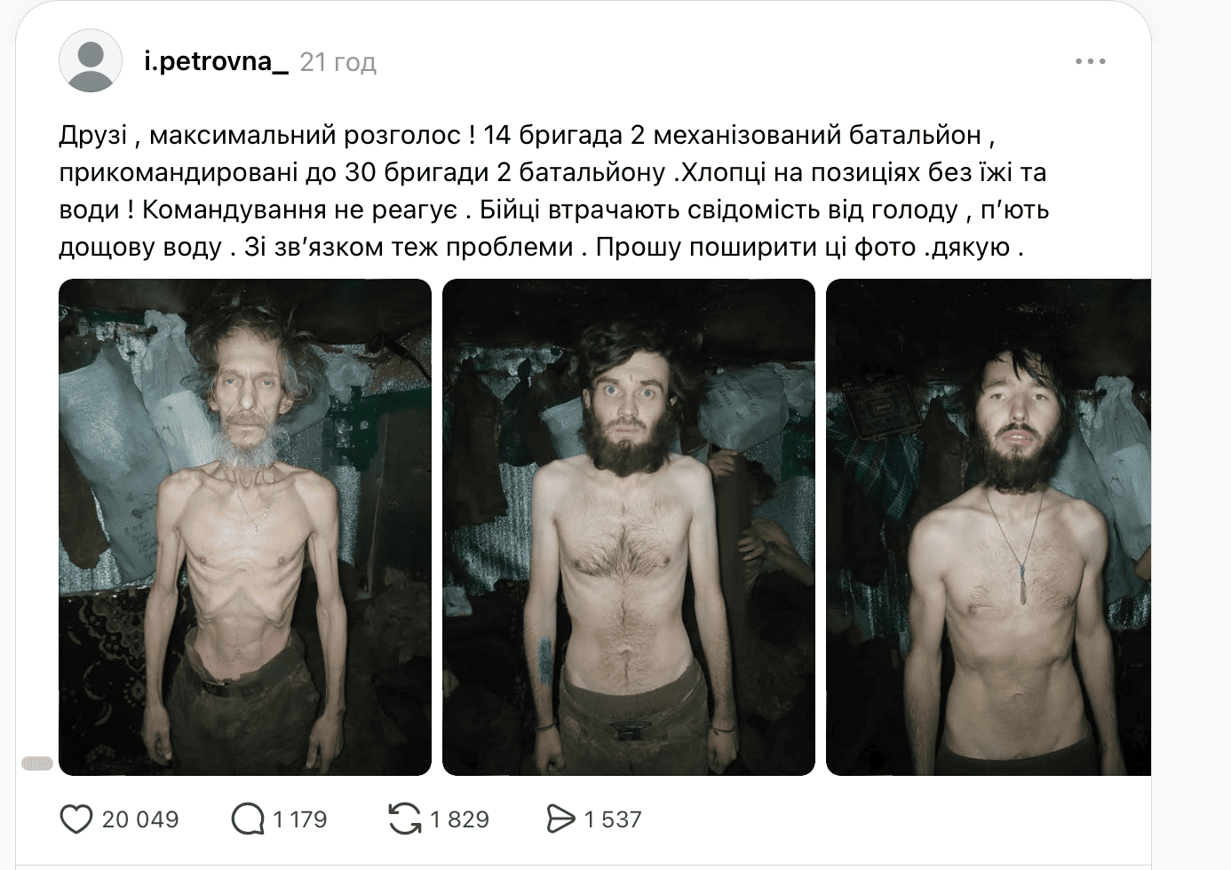 «Друзі, максимальний розголос! 14-та бригада, 2-й механізований батальйон, прикомандировані до 30-ї бригади 2-го батальйону. Хлопці на позиціях без їжі та води! Командування не реагує. Бійці втрачають свідомість від голоду, п’ють дощову воду. Зі зв’язком теж проблеми. Прошу поширити ці фото», — зазначалося у дописі.