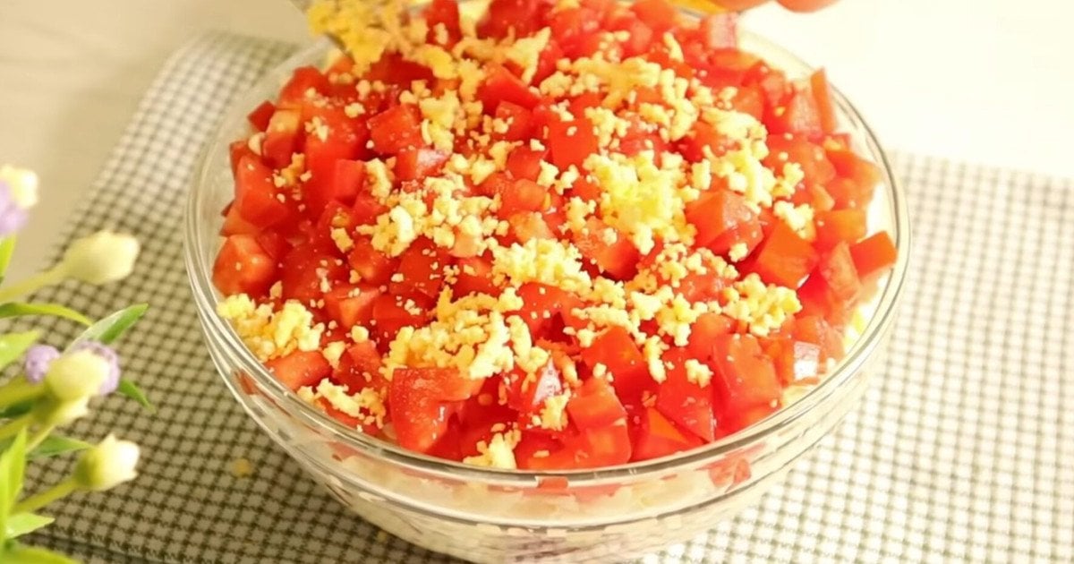 Зверху викладіть натерті яйця та сир, формуючи легку, повітряну “шапочку”, що контрастує з яскравим червоним низом і додає ніжності.