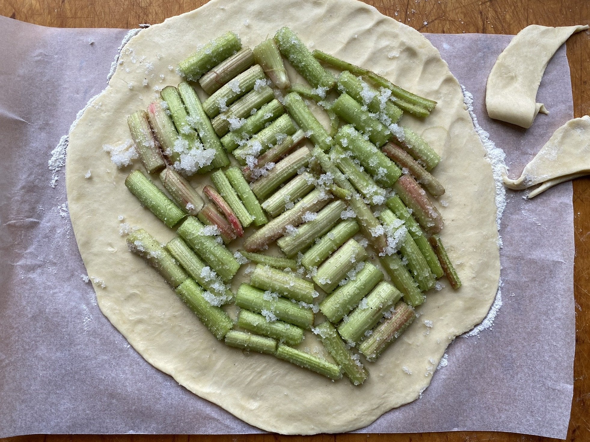Підготовлений ревінь потрібно розподілити поверхнею тіста рівним шаром, уникаючи утворення гірки. Кожен шматочок треба викладати обережно, залишаючи водночас по периметру вільну смугу шириною близько 4 см. Солодкий сік із цукром, який залишився у мисці після змішування начинки, треба рівномірно вилити зверху на пагони.