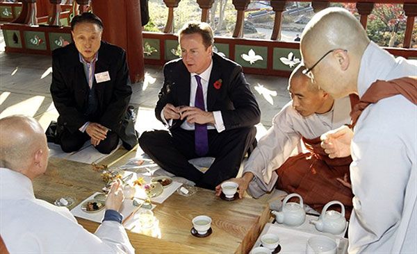 Республіка Корея, Сеул. Британський прем'єр-міністр Девід Камерон розмовляє з ченцями храму Бонгеун під час чайної церемонії в Сеулі. Лідери G20 провели другий день переговорів з питань врегулювання стану світової економіки. / © AFP