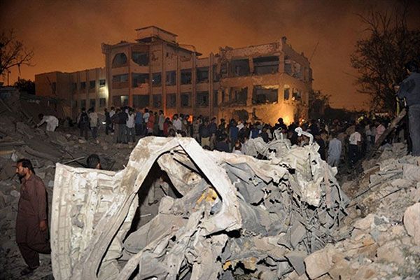 Пакистан, Карачі. Рятувальні служби та співробітники служби безпеки збираються на місці вибуху у Карачі. Бойовики, озброєні вогнепальною зброєю і бомбою у вантажівці, зруйнували поліцейський відділок у найбільшому місті Пакистану. В результаті вибуху, загинули 18 людей, близько 100 осіб отримали поранення. / © AFP
