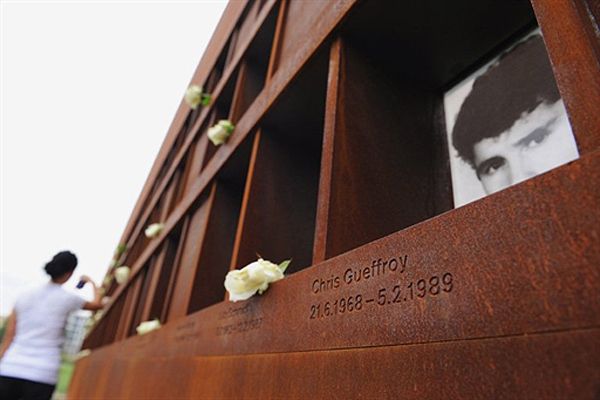 Жінка вшановує пам'ять людей, які були вбиті під час спроби перелізти через Берлінський мур. 13 серпня Німеччина відзначає 49 річницю зведення муру. На фото портрет останньої жертви радянських прикордонників Кріса Гоффроя. / © AFP