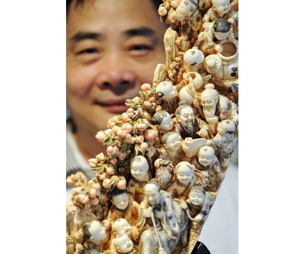 Співробітник китайської ювелірної компанії Prestige Crafts Чу Шінг виставив на аукціон бивень мамонта, вздовж якого вирізані сцени з життя буддистів, китайські пейзажі та навіть еротичні сцени. / © AFP
