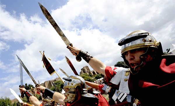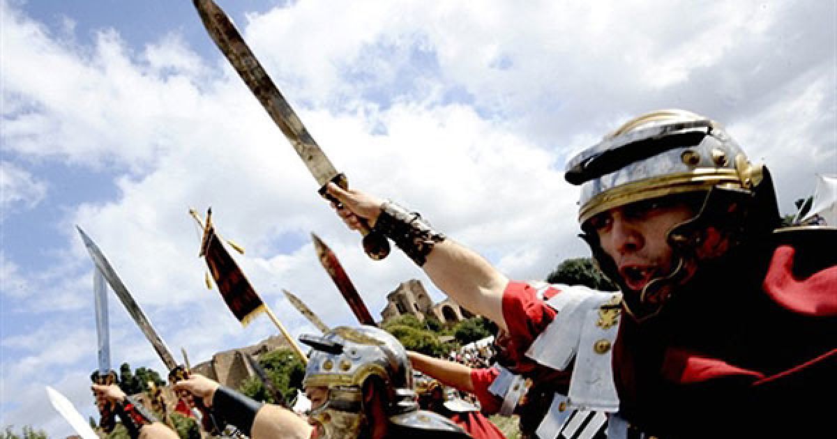 Італія, Рим. Люди у костюмах римських легіонерів готуються до боротьби з "кельтами" під час історичної реконструкції "Senatus Populusque Romanus" у цирку Massimo в Римі. / © AFP