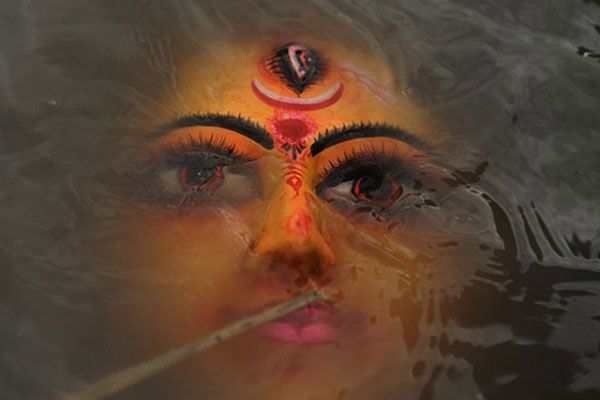 Індія, Сілігурі. Обличчя індуїстської богині Дурги плаває у воді під час церемонії занурення ідолів у річку Махананда Дусшера у заключний день свята Дурга Пуджа. Щорічне свято Дурга Пуджа, яке індуси відзначають на честь богині Дурге, що символізує владу і перемогу добра над злом у індуїстській міфології, завершується традиційним зануренням ідолів у воду. / © AFP