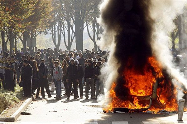 Франція, Ліон. Відбулись зіткнення студентів вищої школи з поліцейськими під час акції протесту в Ліоні. Студенти виступали проти проведення урядової пенсійної реформи. Студентські протести стали частиною загальнонаціональних акції проти реформи президента Ніколя Саркозі, в яких взяли участь мільйони французів по всій країні. / © AFP