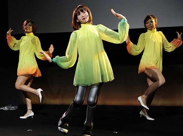 Японія, Токіо. Гуманоїдний робот HRP-4C, зріст якого становить 1,58 м, співає і танцює разом зі "справжніми" танцюристками на виставці "Цифровий Зміст" у Токіо. Робота-гуманоїда HRP-4C створила японська компанія науки і високих технологій AIST. Він отримав назву Choreonoid. / © AFP