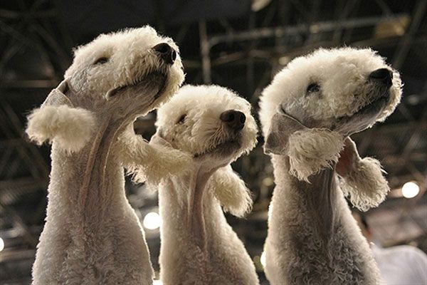 США, Нью-Йорк. Бедлінгтонські тер’єри Плеєр, Дайс і Нора під час участі у щорічній виставці кішок і собак "Познайомтесь з породами", яка відбулась у виставковому центрі Джейкоба К. Явітса у Нью-Йорку. На виставці цього року були представлені 160 порід собак і 41 порода кішок. / © AFP