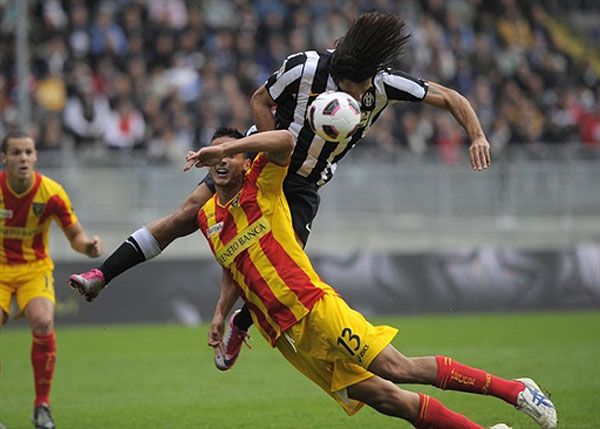 Італія, Турин. Бразильський форвард "Ювентуса" Амаурі Карвальо де Олівейра (праворуч) веде боротьбу за м’яч із захисником "Лечче" Стефано Феррарі під час матчу в Турині. / © AFP