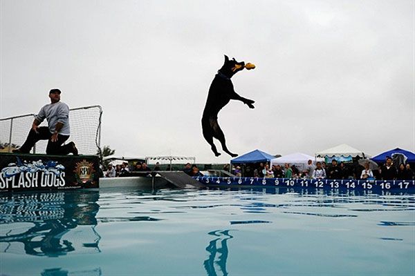 США, Ірвін, штат Каліфорнія. Чорний лабрадор на прізвисько Дизель стрибнув на відстань майже 5 метрів під час змагань зі стрибків серед собак "Dog Splash", які відбулись у Великому парку Оранж Каунті в місті Ірвін, штат Каліфорнія. На змаганнях були проведені конкурси на найкращий трюк серед тварин, найкращий костюм, а також влаштовано масове весілля для собак. / © AFP