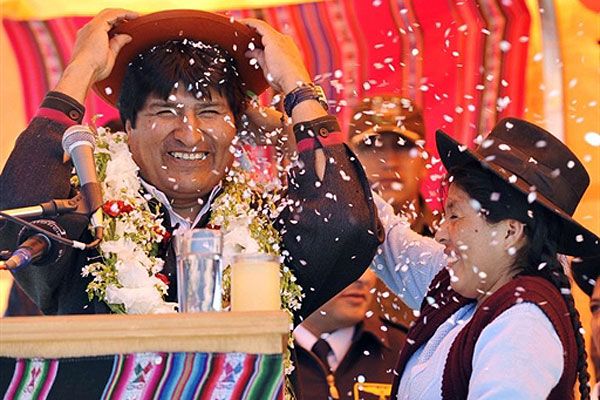 Болівія. Президента Болівії Ево Моралеса зустрічає жінка з племені кечуа під час церемонії в місті Уюні, 550 км від Ла-Паса. / © AFP