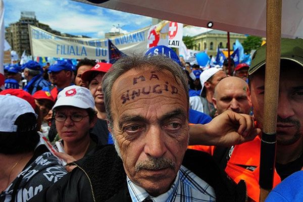 Румунія, Бухарест. Напис на лобі у румунського мітингувальника: "Я вб’ю себе". Перед штаб-квартирою уряду в Бухаресті пройшли масові антиурядові акції протесту. Тисячі мітингувальників висловили протест проти запланованого 25-відсоткового скорочення їхньої заробітної плати. МВФ, ЄС і Світовий банк минулого року уклали "кризову" угоду з Румунією на 20 млрд євро в обмін на скорочення державних видатків у країні. Середній розмір пенсії у Румунії становить близько 190 євро, середня зарплата близько 350 євро. / © AFP
