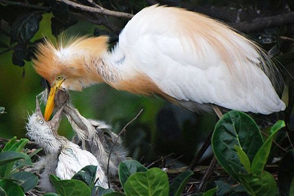 Індія, Гувахаті. Сіра чапля годує своїх новонароджених чапленят на березі річки Брахмапутра. Десятки чапель гніздяться серед дерев у місті Панбазар, основному бізнес-центрі Гувахаті, раз на рік. Але урбанізація загрожує птахам, оскільки дерева активно вирубуються, щоб звільнити місце для будівництва. / © AFP