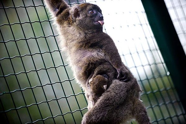 Франція, Безансон. Лемур на прізвисько Сорья тримає свого місячного малюка у зоопарку Безансона на сході Франції. Вид лемурів Hapalemur Simus мешкає на Мадагаскарі і є одним із найшвидше зникаючих приматів у світі. Таких лемурів у світі лишилось тільки 20. / © AFP