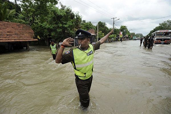 Шрі-Ланки, Коломбо. Поліцейський регулює дорожній рух на затопленій вулиці у передмісті Коломбо. Сильні мусонні дощі, які не вщухали протягом 4 днів, спричинили повінь у країні. В результаті розгулу стихії загинуло 17 людей, більше 400 тисяч були змушені залишити свої домівки. Найбільше постраждала від мусону столиця Шрі-Ланки Коломбо, водою розмило під'їзні шляхи до аеропорту. / © AFP