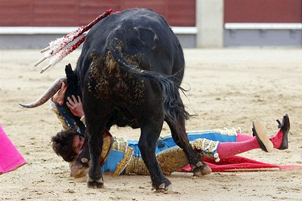 Іспанія, Мадрид. Бик повалив французького матадора Себастьяна Кастеллі під час кориди на арені Лас-Вентас, яку провели на честь святкування Сан-Ісідро у Мадриді. / © AFP