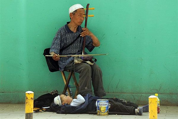Китай, Пекін. Чоловік грає на ерху, доки його дитина спить біля його ніг на вулиці у Пекіні. Китайський прем'єр-міністр нещодавно заявив, що глобальна фінансова криза виявилася серйознішою і складнішою, ніж очікувалося. Влада закликала населення до активізації співпраці, до прискорення економічного підйому. / © AFP