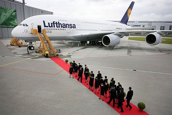 Німеччина, Гамбург. Члени екіпажу піднімаються на борт першого літака Airbus A380 німецької авіакомпанії Lufthansa, який називається "Франкфурт-на-Майні". Lufthansa замовила 15 літаків Airbus A380, чотири з яких будуть введені у експлуатацію вже у 2010 році. / © AFP