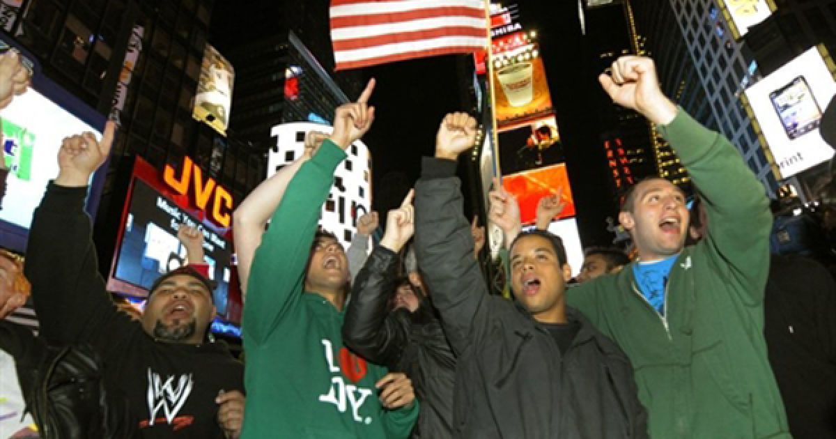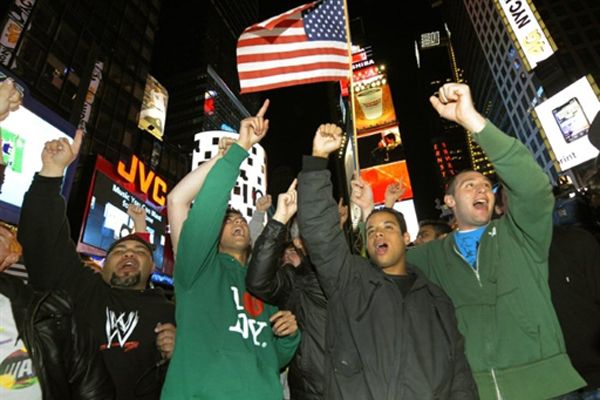США, Нью-Йорк. Жителі Нью-Йорка святкують смерть Осами бен Ладена. Ввечері першого травня Барак Обама повідомив, що армії США вдалося вбити бен Ладена у передмісті Ісламабада. / © AFP