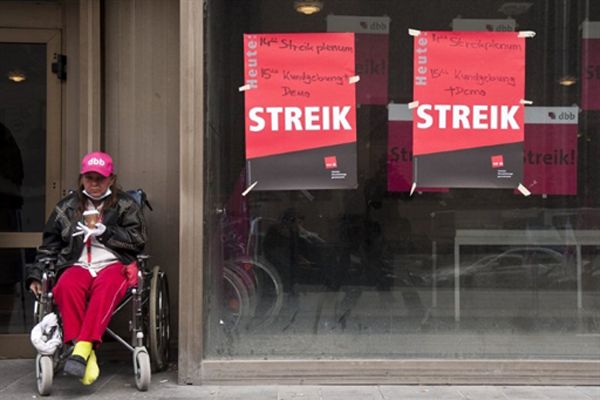 Німеччина, Берлін. Жінка у інвалідному візку сидить біля зачинених дверей госпіталю Charite Mittе. Більше 10 тисяч медичних співробітників оголосили страйк з вимогою підняти зарплати до 300 євро на місяць. / © AFP