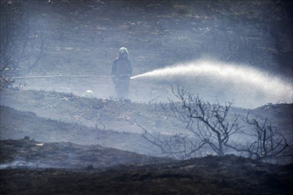 Нідерланди, Схорл. Рятувальник намагається загасити пожежу поблизу міста Схорл. Лісові пожежі у Нідерландах вже знищили більше 300 гектарів угідь. / © AFP