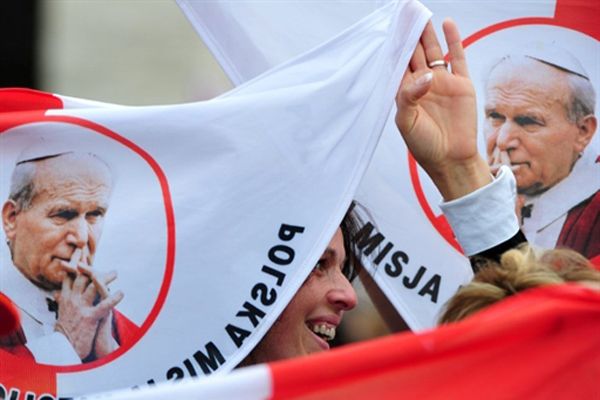 Ватикан. Польські паломники тримають прапори із зображенням Папи Іоана Павла ІІ під час святкової меси на площі Святого Петра. Першого травня Папа Бенедикт XVI зарахував Іоана Павла ІІ до лику блаженних. / © AFP