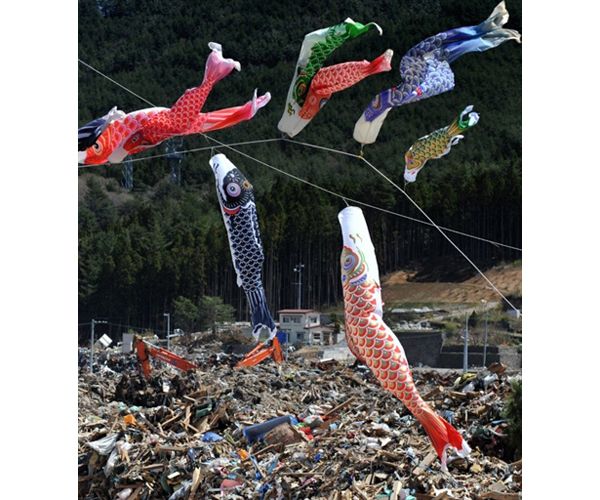 Японія, Ямада. Традиційні ліхтарики у формі коропів, якими прикрашають вулиці та домівки на честь Дня захисту дітей, розвішені над руїнами будинків у Ямаді. Внаслідок землетрусу та цунамі, яке сталося 11 березня, загиблими та зниклими без вісти вважаються 26 тисяч людей. / © AFP