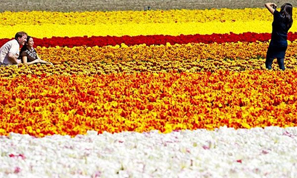 Нідерланди, Ліссе. Туристи фотографуються на барвистих полях тюльпанів у місті Ліссе. Щороку квітучі тюльпани збирають в Ліссе тисячі туристів з усього світу. / © AFP