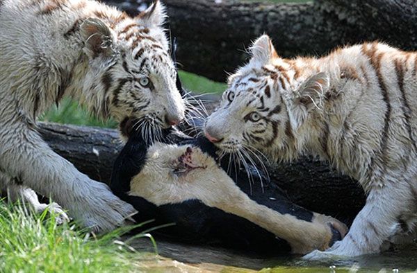 Німеччина, Ходенхаген. Білі тигри доїдають голову корови у своєму вольєрі у парку тварин Серенгеті в північно-західному німецькому місті Ходенхаген. / © AFP