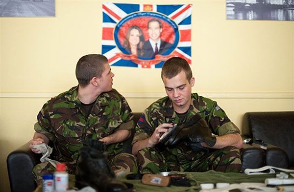 Великобританія, Лондон. Шотландські гвардійці Коннор Фергюсон і Томас Отс полірують чоботи у казармах Веллінгтона в центрі Лондона. Гвардійці братимуть участь у королівському весіллі британського принца Вільяма та його нареченої Кейт Міддлтон. / © AFP