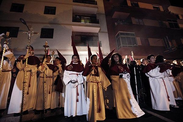 Іспанія, Тенеріфе. Люди у костюмах дивляться на статую Діви Пейн під час підготовки до святкування Великодня на іспанському острові Тенеріфе. Віруючі християни по всьому світу відзначають Святий тиждень на честь розп'яття та воскресіння Ісуса Христа. / © AFP