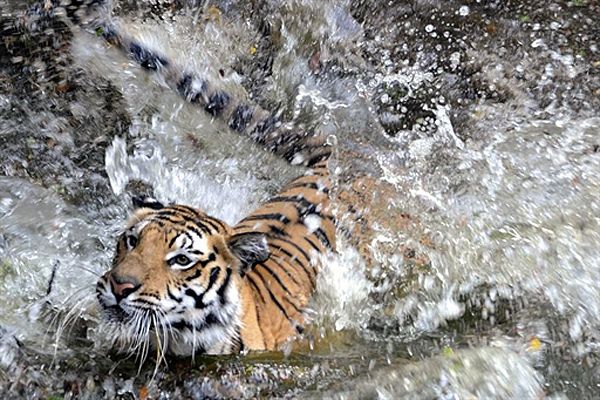 Бенгальський тигр купається у ставку у своєму вольєрі у зоопарку Хайдерабада. Цього року в Індії видалася найспекотніша за останні 30 років весна. / © AFP