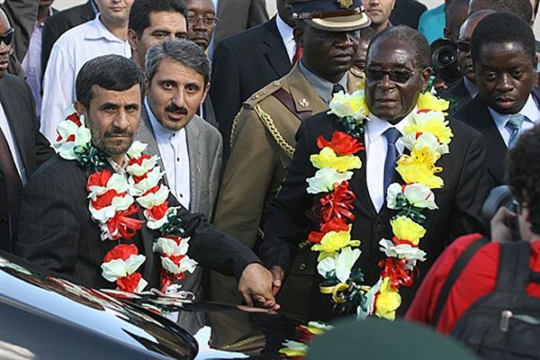 Президент Зімбабве Роберт Мугабе зустрічає президента Іран Махмуда Ахмадінеджада у аеропорті Хараре. Ахмадінеджад прибув до Зімбабве на запрошення Мугабе для участі в інвестиційному форумі. Опозиція Зімбабве жорстоко розкритикувала візит президента Ірану, оскільки це може зашкодити міжнародному авторитету країни. / © AFP