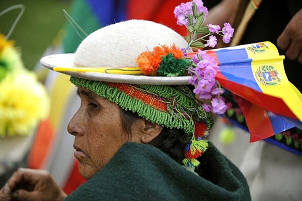 Жінка у національному костюмі та прапорцями Венесуели у капелюшку бере участь у Всесвітній конференції з проблем зміни клімату у Кочабамбі, Болівія. Вчора у світі відзначався День Землі. / © AFP