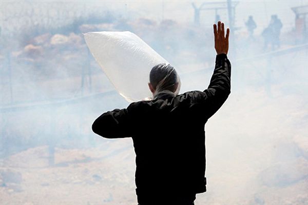 Протестувальник закрився від сльозоточивого газу, який застосувала ізраїльська поліція під час акції протесту у Рамаллі. Посол США Джордж Мітчел закликав міністра оборони Ізраїлю Ехуда Барака до поновлення мирних переговорів з Палестиною. / © AFP