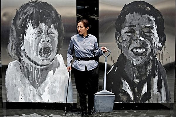 Співробітниця французького павільйону Всесвітньої виставки стоїть між картин, які прикрашають павільйон. Офіційне відкриття Всесвітньої виставки у Шанхаї відбудеться 1 травня, проте павільйони вже відкриті для відвідувачів. / © AFP