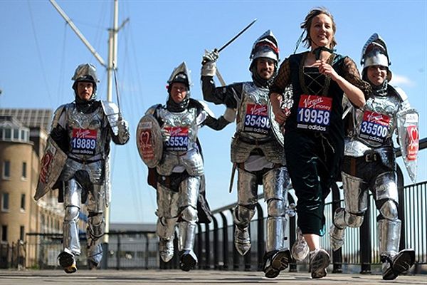 Спортсмени у костюмах лицарів Круглого столу та леді Гвіневри позують для реклами Лондонського марафону 2010 року. Сам марафон відбудеться 25 квітня. / © AFP