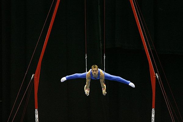 Флавіус Кочі з Румунії виконує вправу на кільцях на Чемпіонаті Європи зі спортивної гімнастики у Бірмінгемі. / © AFP