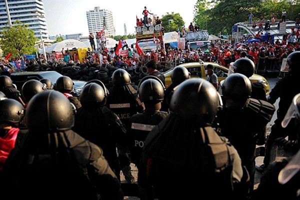 Поліцейський кордон навпроти барикад "червоних сорочок" у Банкоку. Поліція розпочала застосовувати силу проти протестувальників після учорашніх вибухів у бангкокському метро. / © AFP