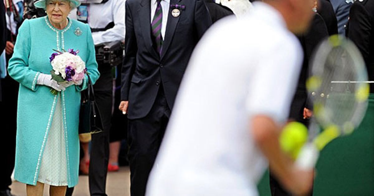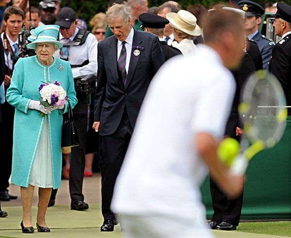 Великобританія, Лондон. Британська королева Єлизавета II у супроводі голови Всеанглійського клубу великого тенісу Тіма Філліпса відвідала четвертий день чемпіонату з тенісу "Вімблдон". Королева Єлизавета ІІ привітала спортсменів і подивилась кілька сетів. / © AFP