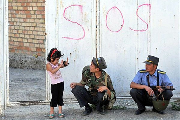 Киргизстан, Ош. Дівчинка розмовляє з киргизькими поліцейськими, які здійснюють обшук у будинках етнічних узбеків у місті Ош. Влада Киргизстану заявила, що більше половини з тих, хто втік до сусіднього Узбекистану під час кривавих міжетнічних зіткнень, повернулися до країни. / © AFP