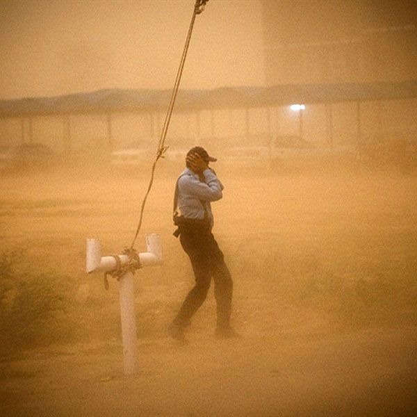 Пакистан, Ісламабад. Пакистанський поліцейський ховається від пилової бурі на КПП у Ісламабаді. На місто обрушилась піщана буря із невеликим дощем. Очікується, що потужні бурі наближаються до Ісламабаду, Пенджабу, Лахору, Гужранвали. / © AFP
