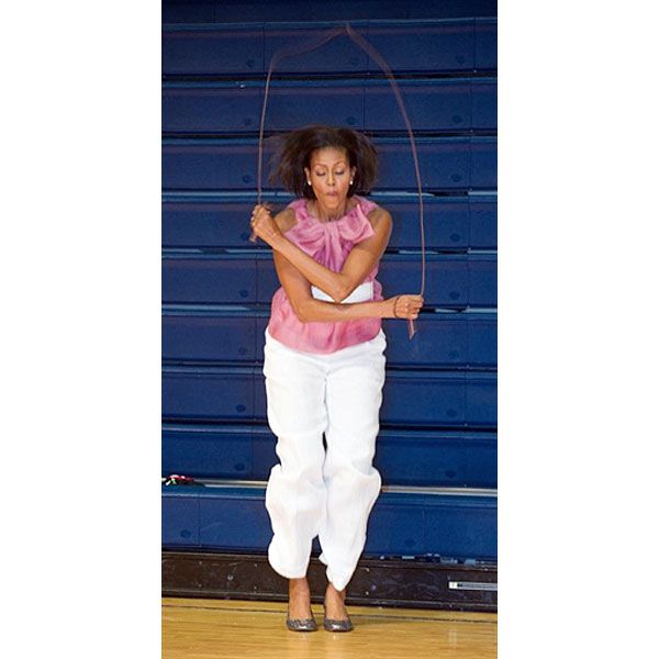 США, Вашингтон. Перша леді США Мішель Обама стрибає через мотузку під час візиту до освітнього табору "Columbia Heights", де вона зустрілась зі студентськими лідерами. У Вашингтоні почала працювати президентська рада з питань фітнесу, спорту і здорового харчування. / © AFP