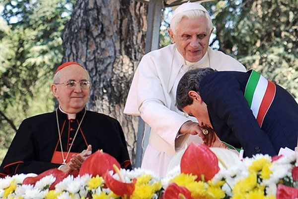 Італія, Рим. Мер Риму Джанні Алеманно цілує руку Папі Римському Бенедикту XVI під час його візиту до центру Дон Оріоні для отримання благословення від Мадонни Дон Оріоні. Статуя, що, як вважають, охороняє Рим, була серйозно пошкоджена під час шторму, а тепер повернулася на колишнє місце після реставрації. / © AFP