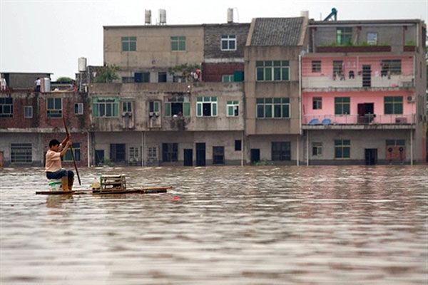 Китай, Фучжоу. Китаєць пливе на саморобному плоту затопленими вулицями міста Фучжоу у провінції Цзянсі східного Китаю. Синоптики попереджають про нові зливи, які насуваються на країну. Південна частина Китаю вже постраждала від повеней і попередніх злив, які забрали життя більше 200 людей. / © AFP