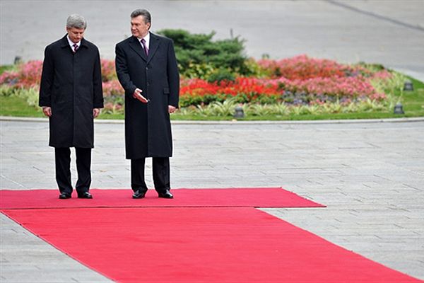 Президент України Віктор Янукович розмовляє із прем’єр-міністром Канади Стівеном Харпером під час урочистої церемонії з нагоди початку візиту канадського прем’єра до України. Харпер здійснить офіційний триденний візит. / © AFP