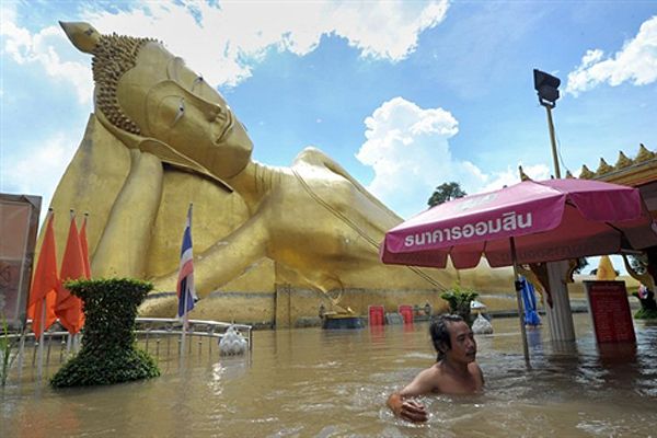 Чоловік пливе крізь затоплену центральну площу Аюттхаї. Таїланд вже 2 тижні страждає від повені, викликаної зливами. Кілька мільйонів таїландців втратили свої домівки, переважна кількість сільськогосподарських угідь у північних провінціях повністю знищено. / © AFP