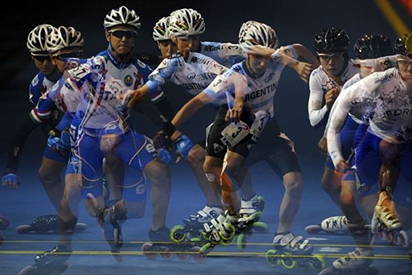 Старт італійця Альберто Путінано, аргентинця Сантьяго Румека та корейця Мін Су Кіма у фінальному заїзді на 3000 метрів серед юніорів на Чемпіонаті Світу з бігу на роликових ковзанах у Медельїні. / © AFP