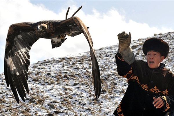 Чоловік запускає свого беркута під час національного свята полювання у Боконбаєві, Киргизія. / © AFP
