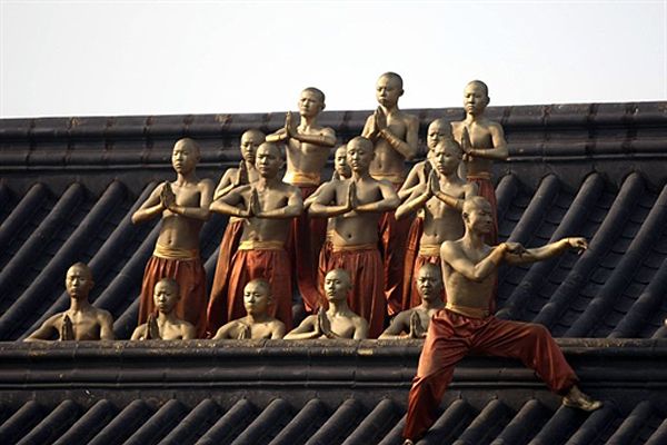 Молоді шаолінські монахи беруть участь у виставі для туристів на честь фестивалю гунфу у китайській провінції Хенань. Зараз монастирі Шаоліню існують переважно за рахунок продажу сувенірів через інтернет та гастрольних виступів. / © AFP